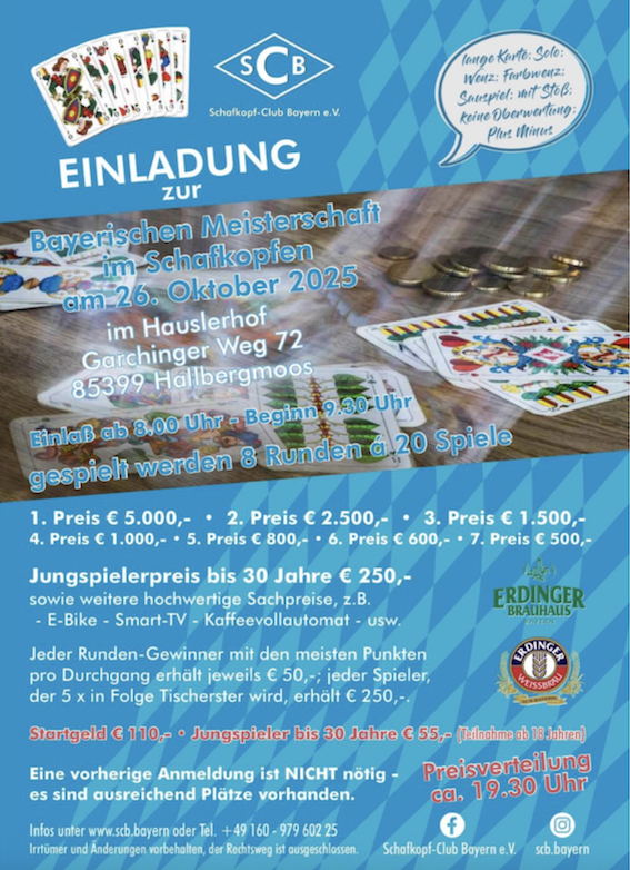 Sie Schafkopf Roas zu gewinnen gibt es Tickets fürs Finale Wert 80€ Im Finale werden für Platz 1 1500€ garantiert.