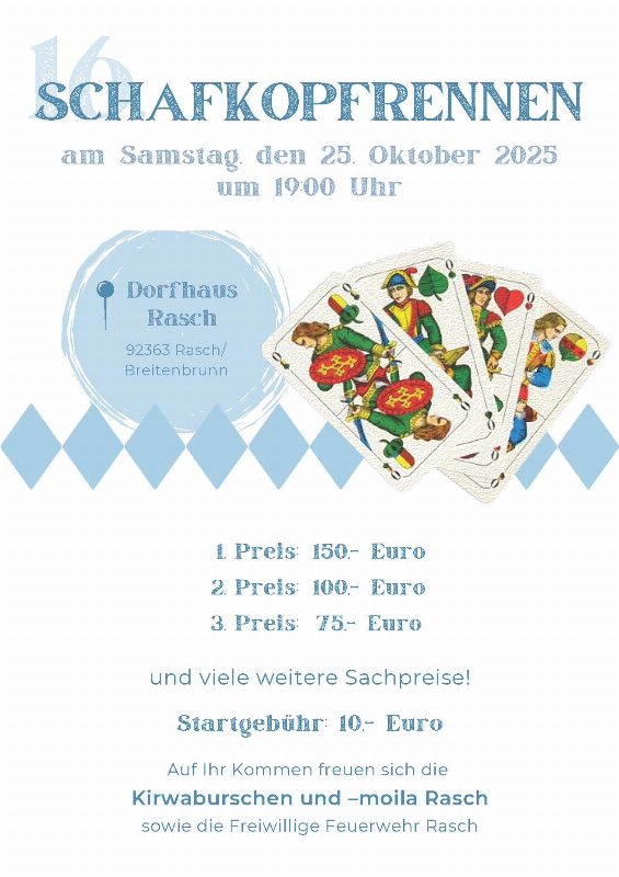 1. Preis 100 Euro und viele weitere Sachpreise für jeden Teilnehmer Einlass ab 18:30 Uhr Rückfragen und Anmeldungen: Ulla Schwarte 0911-9748575 langes Blatt, mit Solo Plus Punkte Web: https://wg-obermichelbach.de/
