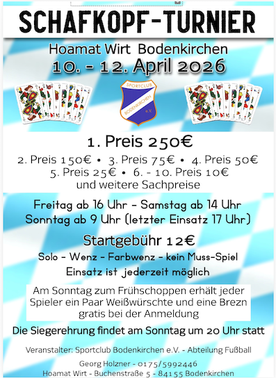 5. Preis 25€, 6.-10. Preis 10€ und weitere Sachpreise.